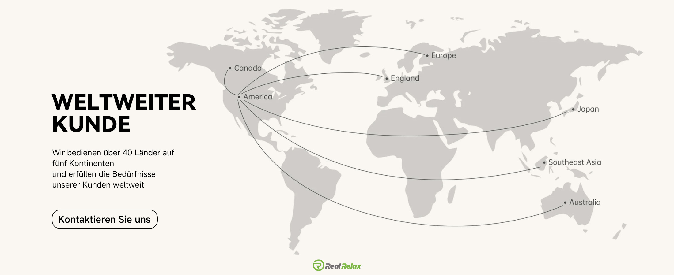 Wir gründeten RealRelax, um jedem Nutzer einen Massagesessel von hoher Qualität zu einem erschwinglichen Preis anzubieten. Unsere Sessel werden mit größter Sorgfalt und Präzision designed und ausschließlich aus Hochqualitätsmaterialien hergestellt – damit du dich immer entspannt, komfortabel und gesund fühlst. In 10 Jahren haben wir die Sitzerfahrung von Nutzern in über 40 Ländern weltweit verbessert, darunter die Vereinigten Staaten, Kanada, Großbritannien, Australien, Japan sowie Regionen wie Europa und Südostasien. Und wir stehen erst am Anfang. Unsere Zielsetzung? Die Entwicklung eines RealRelax-Massagesessels, mit dem du echte Entspannung erlebst.